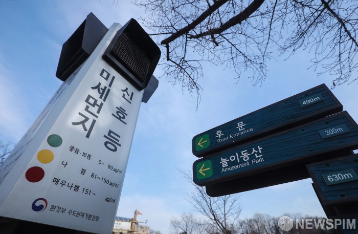 [서울=뉴스핌] 윤창빈 기자 = 서울의 미세먼지 농도가 ‘보통’수준을 보인 9일 오후 서울 광진구 어린이대공원에 설치된 미세먼지 신호등 뒤로 맑은 하늘이 보이고 있다. 2019.03.09 pangbin@newspim.com