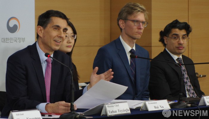 [서울=뉴스핌] 백인혁 인턴기자 = 넥메틴 타르한 페이지오 글루 IMF 연례협의 미션단장 등 이 12일 오후 서울 종로구 정부서울청사에서 2019년 IMF 연례협의 주요 결과를 발표하고 있다. 2019.03.12 dlsgur9757@newspim.com