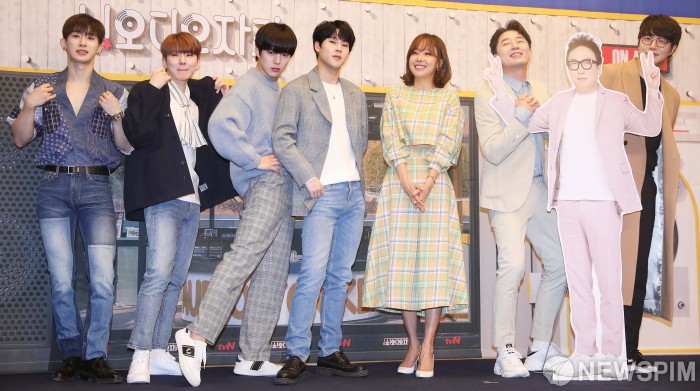 [서울=뉴스핌] 윤창빈 기자 = 그룹 몬스타엑스의 원호(왼쪽부터),기현,민혁,주헌,배우 소유진,가수 붐,성시경이 13일 오전 서울 마포구 스탠포드호텔에서 열린 tvN 새 예능프로그램 ‘쇼!오디오자키’ 제작발표회에서 포토타임을 가지고 있다. ‘쇼!오디오자키’는 오디오 자키들이 선보이는 다양한 컨텐츠를 보이는 라디오 형식에 담아낸 예능 프로그램이며, 오는 17일(일)에 tvN에서 첫 방송된다. 2019.03.13 pangbin@newspim.com