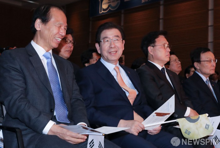 [서울=뉴스핌] 최상수 기자 = 최문순 강원도지사, 박원순 서울시장이 14일 오후 서울 용산구 백범김구기념관에서 열린 한반도 새100년위원회 출범식에서 활짝 웃고 있다. 2019.03.14 kilroy023@newspim.com
