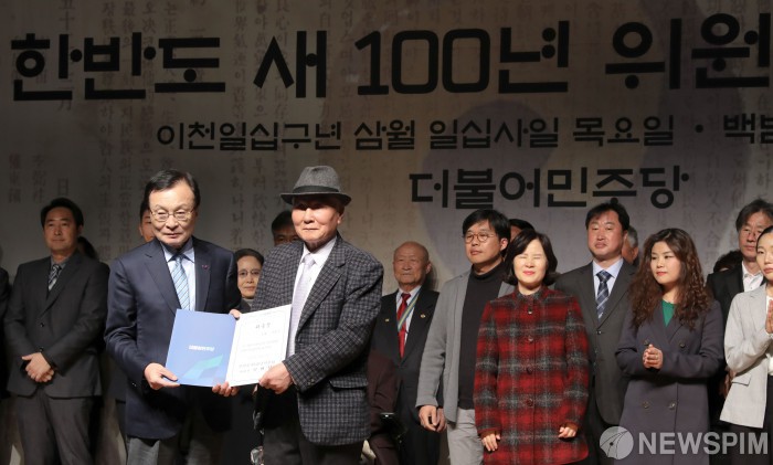 [서울=뉴스핌] 최상수 기자 = 이해찬 더불어민주당 대표가 14일 오후 서울 용산구 백범김구기념관에서 열린 한반도 새100년위원회 출범식에서 국민 100년위원에게 위촉장을 수여하고 있다. 2019.03.14 kilroy023@newspim.com