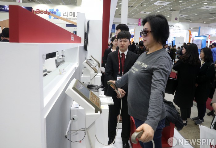 [서울=뉴스핌] 정일구 기자 = 14일 오후 서울 강남구 코엑스에서 열린 '제35회 국제의료기기·병원설치 전시회(KIMES 2019)'에서 관람객들이 의료기기 체험을 하고 있다. 2019.03.14 mironj19@newspim.com