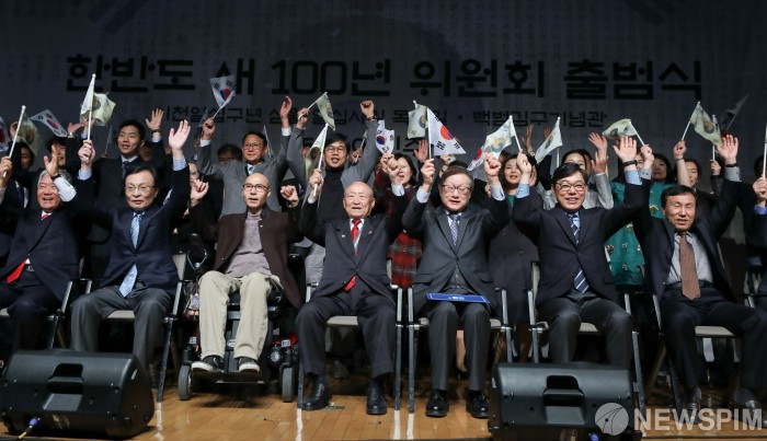 [서울=뉴스핌] 최상수 기자 = 이해찬 더불어민주당 대표 및 국민 100년위원들이 14일 오후 서울 용산구 백범김구기념관에서 열린 한반도 새100년위원회 출범식에서 만세 삼창을 하고 있다. 2019.03.14 kilroy023@newspim.com