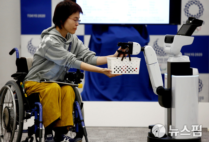 | [도쿄 로이터=뉴스핌] 오영상 전문기자 = 토요타자동차가 개발한 인간지원로봇(Human Support Robot, HSR)이 휠체어를 탄 여성에게 바구니를 건네 주고 있다. 2019.03.15 |