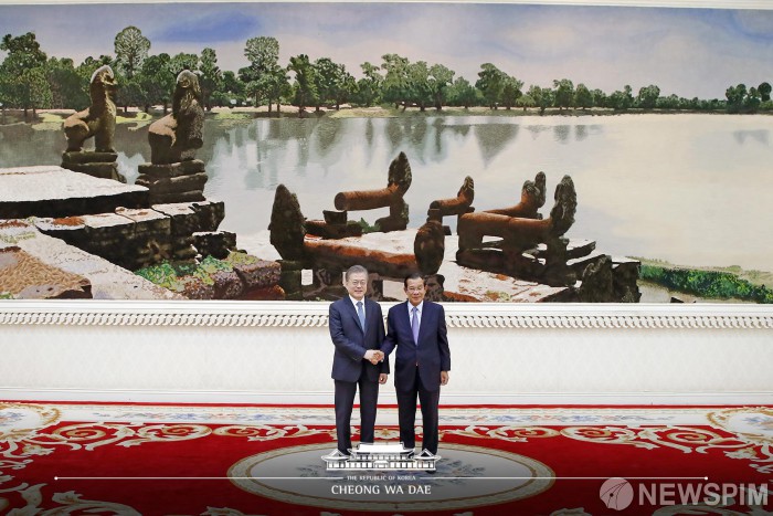 [서울=뉴스핌] 문재인 대통령이 15일 오전(현지시간) 정상회담을 위해 총리 집무실인 프놈펜 평화궁에 도착해 훈센 총리와 기념촬영 하고 있다.[사진=청와대 페이스북] 2019.3.15