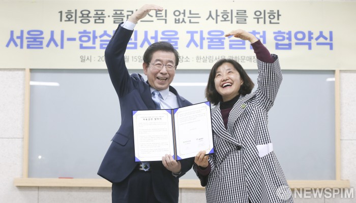 [서울=뉴스핌] 이형석 기자 = 박원순 서울시장과 권옥자 한살림서울 이사장이 15일 오후 서울 종로구 한살림서울 광화문매장에서 열린 '1회용품‧플라스틱 없는 사회를 위한 서울시-한살림서울 자율실천 협약식‘에서 협약서에 사인을 마치고 기념촬영을 하고 있다. 2019.03.15 leehs@newspim.com