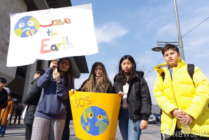[서울=뉴스핌] 백인혁 인턴기자 =청소년 단체 '청소년기후소송단' 회원들이 15일 오후 서울 종로구 세종문화회관 앞에서 열린  '3.15 청소년 기후행동'에서 기후변화 문제에 대한 적극적 대응을 촉구하고 있다.  2019.03.15 dlsgur9757@newspim.com