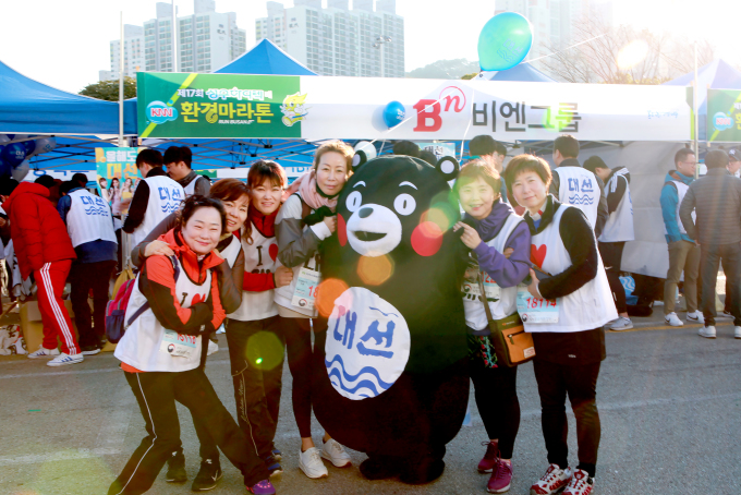 | 대선주조㈜ 임직원들이 17일 해운대 벡스코에서 열린 제17회 성우하이텍배 KNN 환경마라톤에서 쿠마몬 인형 옷을 입고 대회에 참가한 시민들을 응원하고 있다.[사진=대선주조]2019.3.17. |