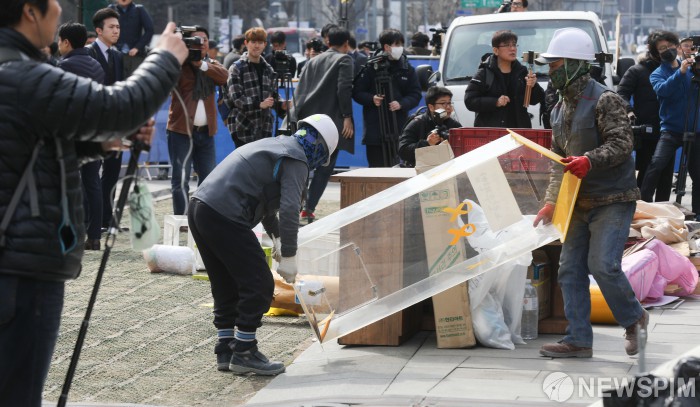 [서울=뉴스핌] 최상수 기자 = 18일 오전 서울 종로구 광화문광장에서 세월호 참사 희생자 및 미수습자 분향소가 설치된 후 약 4년 8개월 만에 철거되고 있다. 2019.03.18 kilroy023@newspim.com
