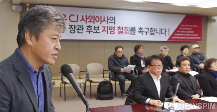 [서울=뉴스핌] 백인혁 인턴기자 = 배우 권해효가 18일 오전 서울 중구 프레스센터에서 열린 박양우 문화체육관광부 장관 후보자의 지명 철회를 촉구하는 반독과점 영화인대책위원회 기자회견장에서 발언 하고있다. 2019.03.18 dlsgur9757@newspim.com