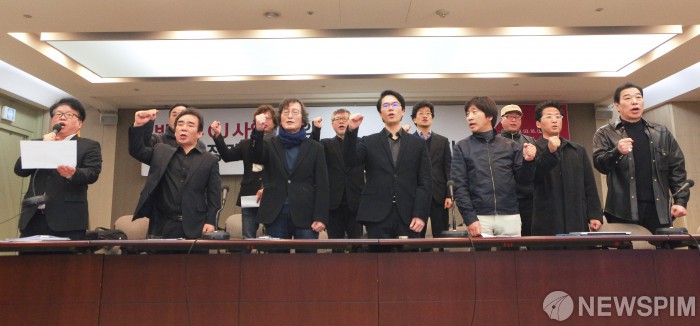 [서울=뉴스핌] 백인혁 인턴기자 = 18일 오전 서울 중구 프레스센터에서 열린 박양우 문화체육관광부 장관 후보자의 지명 철회를 촉구하는 반독과점 영화인대책위원회 기자회견장에서 참석자들이 구호를 외치고 있다. 2019.03.18 dlsgur9757@newspim.com