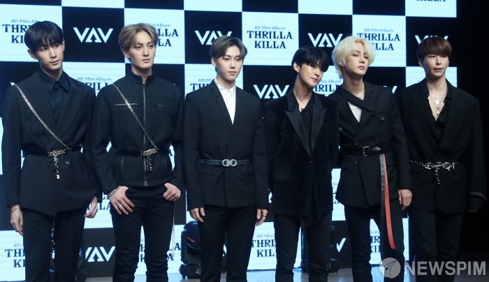 [서울=뉴스핌] 정일구 기자 = 보이그룹 VAV가 18일 오후 서울 강남구 일지아트홀에서 열린 네 번째 미니앨범 '쓰릴라킬라(THRILLA KILLA)' 발매 기념 쇼케이스에서 포즈를 취하고 있다. 타이틀곡 '쓰킬라킬라(THRILLA KILLA)'는 중독성 강한 레트로 사운드가 돋보이는 곡으로 그 누구도 자신의 매력에서 벗어나지 못하게 할 만큼 '치명적으로 매력적인 사람'이란 뜻을 담고 있다. 2019.03.18 mironj19@newspim.com