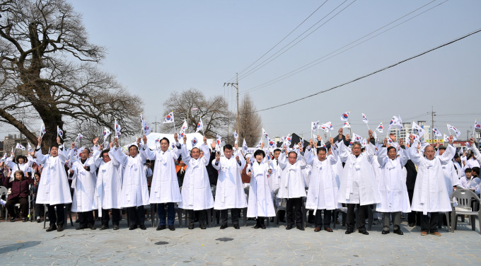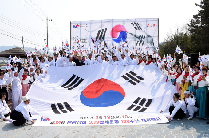 [김제=뉴스핌] 이백수 기자 = 전북 김제지역 최초로 금산면 원평장터에서 1919년 3월 20일 일어났던 3.1 만세운동을 되새기기 위한 만세운동 재현 행사가 같은 장소인 원평장터 기미독립만세운동 기념비 광장에서 19일 재현됐다.
