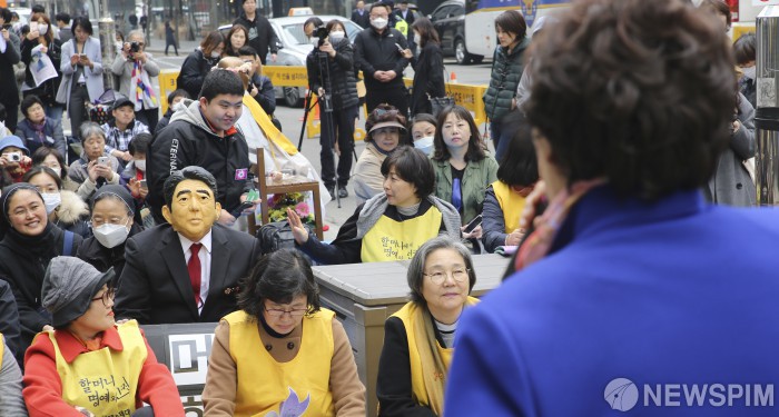 [서울=뉴스핌] 이한결 인턴기자 = 이용수 할머니가 20일 오후 서울 종로구 옛 일본대사관 앞에서 정의기억연대 주최로 열린 일본군 성노예제 문제해결을 위한 제1379차 정기 수요집회에서 아베 가면을 쓴 참가자에게 “고개를 들어라.”고 하고 있다. 2019.03.20