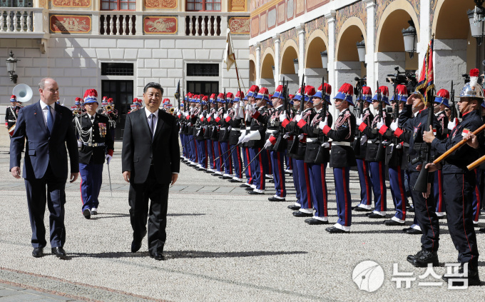 | [모나코 로이터=뉴스핌] 남혜경 인턴기자 = 알베르 2세 모나코 국왕(좌)과 시진핑(習近平) 중국 국가주석이 모나코 대공궁에서 의장대를 사열하고 있다. 2019.03.24. |