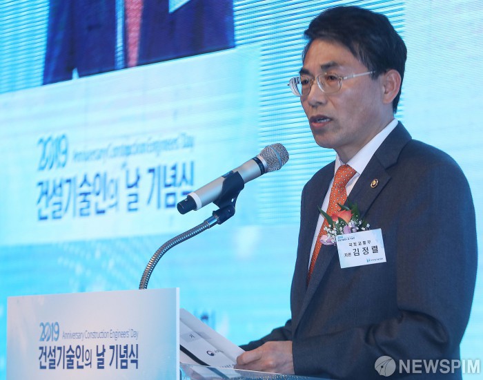 [서울=뉴스핌] 윤창빈 기자 = 김정렬 국토교통부 2차관이 25일 오후 서울 강남구 임피리얼팰리스 호텔에서 열린 2019 건설기술인의 날 행사에서 치사를 하고 있다. 2019.03.25 pangbin@newspim.com