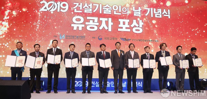 [서울=뉴스핌] 윤창빈 기자 = 김정렬 국토교통부 2차관(오른쪽 여섯번째)과 수상자들이 25일 오후 서울 강남구 임피리얼팰리스 호텔에서 열린 2019 건설기술인의 날 행사에서 기념촬영을 하고 있다. 2019.03.25 pangbin@newspim.com