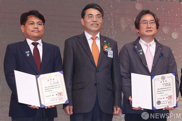 [서울=뉴스핌] 윤창빈 기자 = 김정렬 국토교통부 2차관(가운데)과 수상자들이 25일 오후 서울 강남구 임피리얼팰리스 호텔에서 열린 2019 건설기술인의 날 행사에서 기념촬영을 하고 있다. 2019.03.25 pangbin@newspim.com