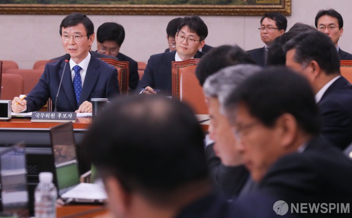 [서울=뉴스핌] 최상수 기자 = 문성혁 해양수산부 장관 후보자가 26일 오전 서울 여의도 국회에서 열린 인사청문회에서 의원들의 질의에 답변하고 있다. 2019.03.26 kilroy023@newspim.com