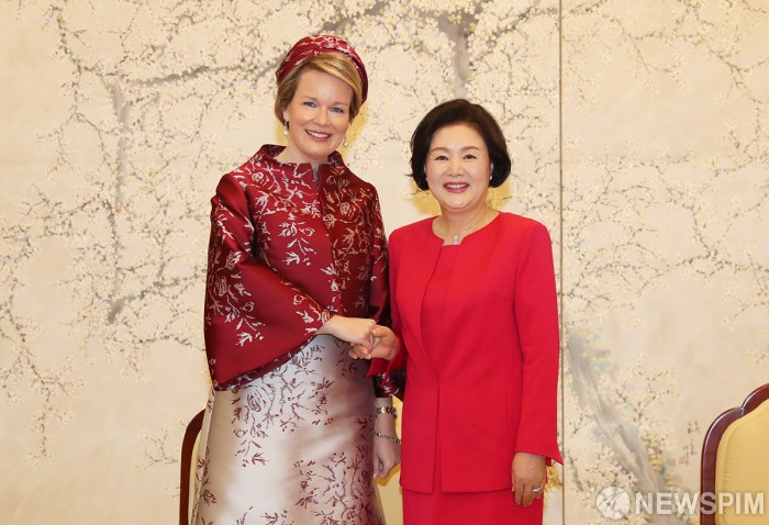[서울=뉴스핌]문재인 대통령 부인 김정숙 여사와 필리프 벨기에 국왕 부인 마틸드 왕비가 26일 오전 청와대에서 환담에 앞서 악수하고 있다. [사진=청와대]. 2019.3.26