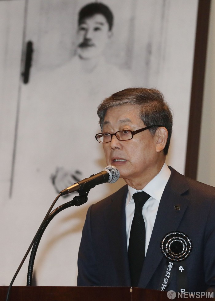 [서울=뉴스핌] 정일구 기자 = 26일 오전 서울 중구 안중근의사기념관에서 열린 '안중근 의사 순국 109주년 추모식'에서 김황식 안중근의사숭모회 이사장이 추모식사를 하고 있다. 2019.03.26 mironj19@newspim.com