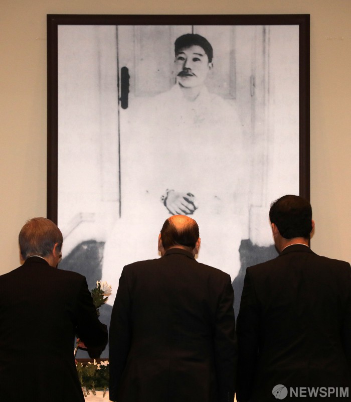 [서울=뉴스핌] 정일구 기자 = 26일 오전 서울 중구 안중근의사기념관에서 열린 '안중근 의사 순국 109주년 추모식'에서 일본인 참석자들이 안 의사 영정 앞에서 헌화를 하고 있다. 2019.03.26 mironj19@newspim.com