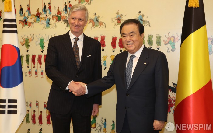 [서울=뉴스핌] 국회사진취재단 =문희상 국회의장이 26일 서울 여의도 국회를 방문한 필립 레오폴 루이 마리 벨기에 국왕과 악수하고 있다. 2019.03.26