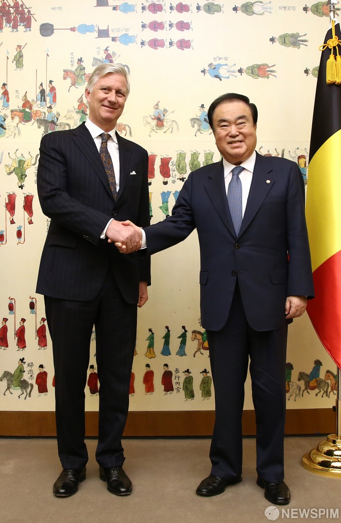 [서울=뉴스핌] 국회사진취재단 = 문희상 국회의장(오른쪽)과 필립 레오폴 루이 마리 벨기에 국왕이 26일 서울 여의도 국회에서 악수하고 있다. 2019.03.26