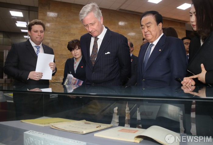 [서울=뉴스핌] 국회사진취재단 = 문희상 국회의장이 필립 레오폴 루이 마리 벨기에 국왕과 26일 서울 여의도 국회 로텐더홀에 마련된 방문기념 특별전을 관람하고 있다. 2019.03.26