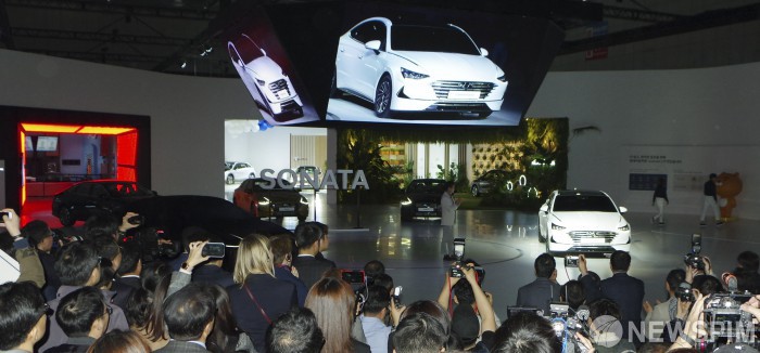 [고양=뉴스핌] 백인혁 인턴기자 = 현대차가 28일 오전 경기도 고양시 킨텍스에서 열린 2019 서울모터쇼 미디어데이에서 소나타 하이브리드를 공개하고 있다. 2019 서울모터쇼는 이달 29일 금요일 개막을 시작으로 내달 7일 일요일 까지 전시된다. 2019.03.28 dlsgur9757@newspim.com