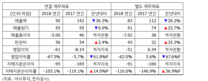 매출액은 40.2% 감소한 18억8301만원, 지배지분 순이익은 적자를 지속한 -66억8123만원이다.