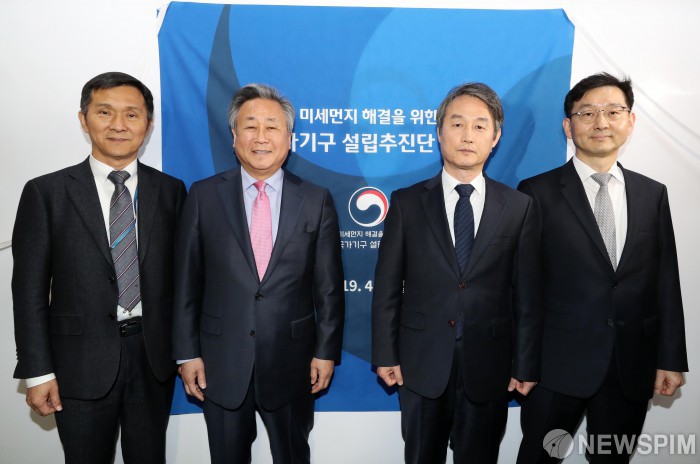 [서울=뉴스핌] 정일구 기자 = 1일 오전 서울 종로구 오피시아빌딩에서 열린 '미세먼지 해결을 위한 범국가기구 설립추진단 현판식'에서 김연명 청와대 사회수석(왼쪽부터), 김숙 전 유엔대사, 안병옥 전 환경부 차관, 윤창열 미세먼지 개선기획단장이 현판 제막에 앞서 기념촬영을 하고 있다. 2019.04.01 mironj19@newspim.com