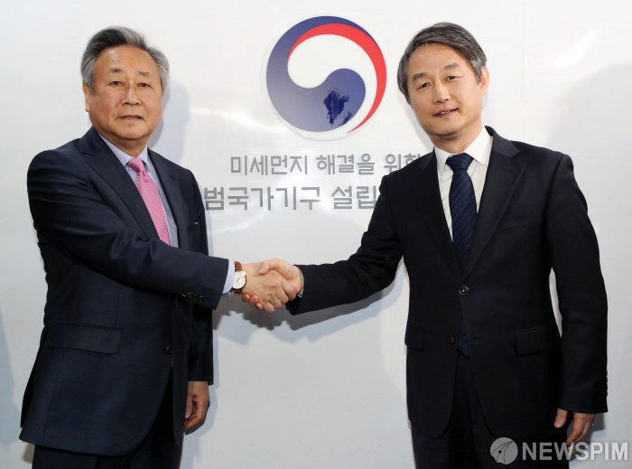 [서울=뉴스핌] 정일구 기자 = 1일 오전 서울 종로구 오피시아빌딩에서 열린 '미세먼지 해결을 위한 범국가기구 설립추진단 현판식'에서 공동 설립추진단장인 김숙 전 유엔대사(왼쪽)와 안병옥 전 환경부 차관이 현판을 제막한 뒤 악수하고 있다. 2019.04.01 mironj19@newspim.com