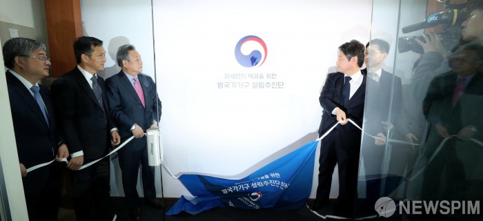 [서울=뉴스핌] 정일구 기자 = 1일 오전 서울 종로구 오피시아빌딩에서 열린 '미세먼지 해결을 위한 범국가기구 설립추진단 현판식'에서 공동 설립추진단장인 김숙 전 유엔대사(왼쪽 세번째)와 안병옥 전 환경부 차관(왼쪽 네번째)이 현판을 제막하고 있다. 2019.04.01 mironj19@newspim.com