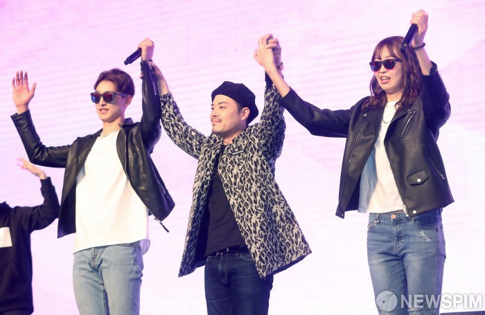 [서울=뉴스핌] 정일구 기자 = 1일 오후 서울 서초구 더케이호텔에서 열린 '2018-2019 V리그 시상식'에서 한국전력 박태환(왼쪽부터), 가수 군조, KGC인삼공사 박은진이 축하무대를 선보이고 있다. 2019.04.01 mironj19@newspim.com
