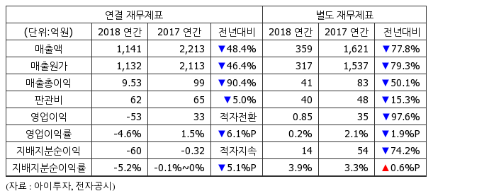 지난해 연간 기준 연결 매출액은 1141억8416만원으로 전년 동기 2213억1964만원 대비 48.4% 감소했다.