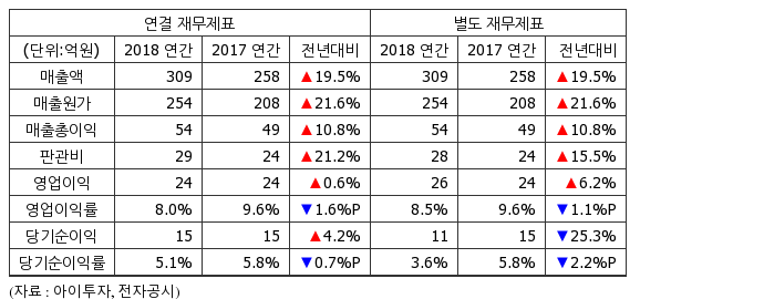 지난해 연간 기준 연결 매출액은 309억530만원으로 전년 동기 258억4762만원 대비 19.5% 늘었다.