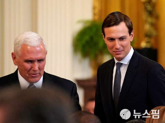 [워싱턴 로이터=뉴스핌] 남혜경 인턴기자 = 1일(현지시간) 미국 백악관 이스트룸에서 열린 '2019 교도소 개혁 서밋'(2019 Prison Reform Summit)에 참석한 마이크 펜스 부통령(좌)과 제러드 쿠슈너 백악관 선임고문. 2019.04.01.