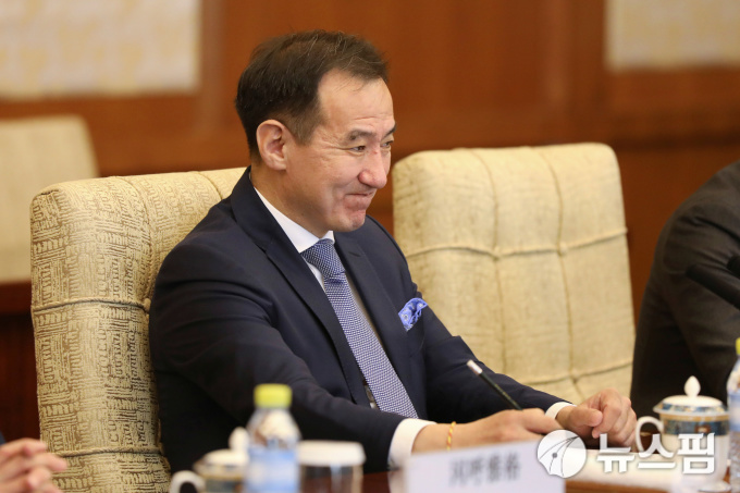| [베이징 로이터=뉴스핌] 남혜경 인턴기자 = 담딘 척트바타르 몽골 외무장관이 중국 베이징 소재 댜오위타이(釣魚台) 국빈관에서 진행된 왕이(王毅) 중국 외교부장 겸 외교 담당 국무위원과의 회담에 참석했다. 왕이 외교부장은 사진 속에 없다. 2019.04.02. |
