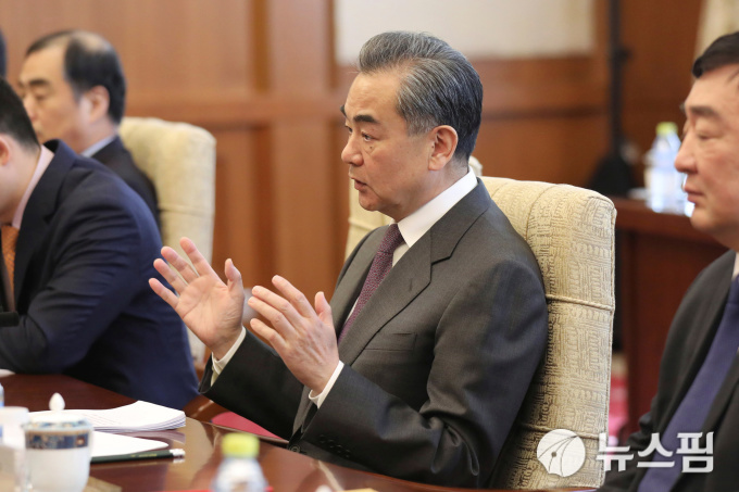 | [베이징 로이터=뉴스핌] 남혜경 인턴기자 = 왕이(王毅) 중국 외교부장 겸 외교 담당 국무위원이 댜오위타이(釣魚台) 국빈관에서 진행된 담딘 척트바타르 몽골 외무장관과의 회담에서 발언하고 있다. 척트바타르 외무장관은 사진 속에 없다. 2019.04.02. |
