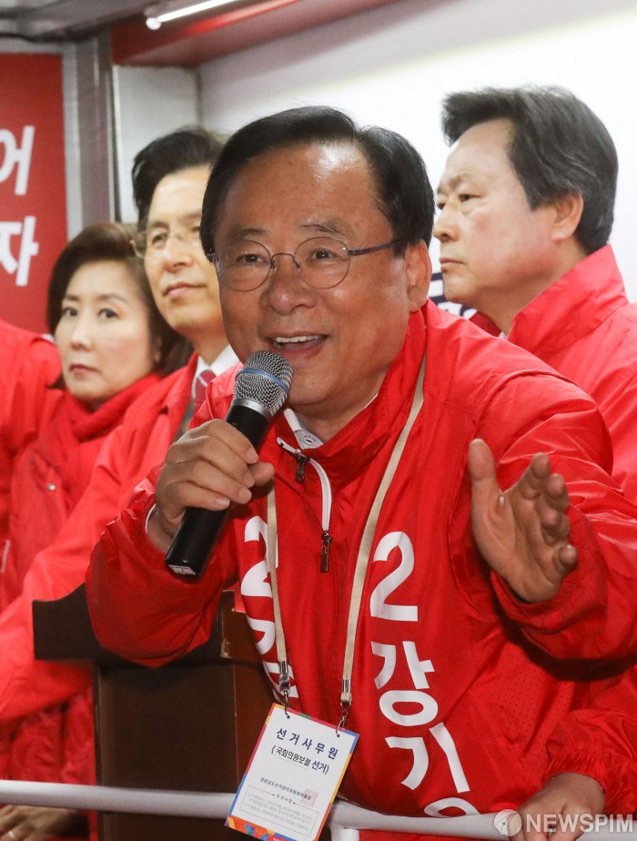 [창원=뉴스핌] 최상수 기자 = 이주영 국회부의장이 2일 오후 경상남도 창원 성산구 분수광장 인근에서 4·3 보궐선거에 출마한 강기윤 자유한국당 후보 지지를 호소하고 있다. 2019.04.02 kilroy023@newspim.com