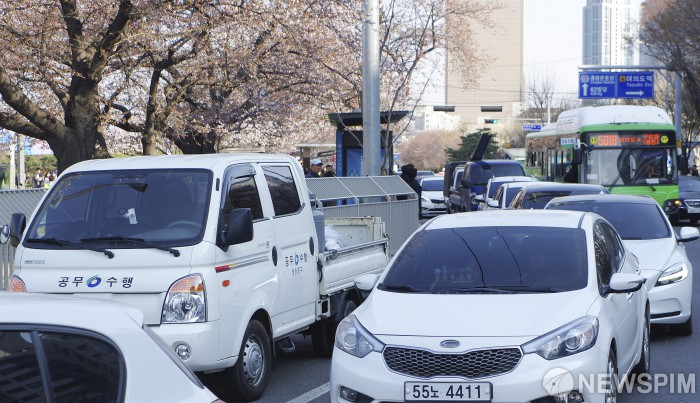 [서울=뉴스핌] 백인혁 인턴기자 = 5일부터 개막되는 여의도 벚꽃축제에 앞서 4일 오후 서울 영등포구 여의도 한강공원 주차장입구가 벌써부터 혼잡을 빚고 있다. 2019.04.04 dlsgur9757@newspim.com