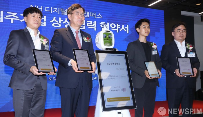 [서울=뉴스핌] 윤창빈 기자 = 이대훈 농협은행장(왼쪽 두번째)과 입주자 대표들이 8일 오전 서울 서초구 NH농협은행 IT센터에서 열린 'NH디지털혁신캠퍼스 출범식'에서 상생협력 협약서에 서명을 하고 기념촬영을 하고 있다. 2019.04.08 pangbin@newspim.com