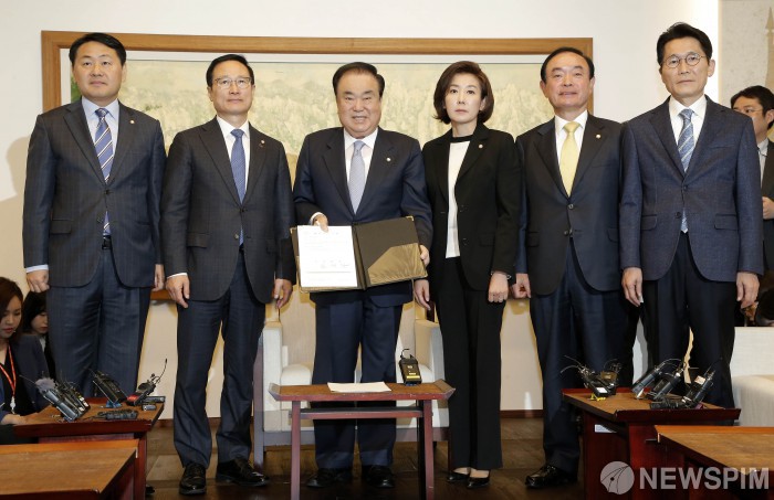 [서울=뉴스핌] 김학선 기자 = 문희상 국회의장과 여야 5당 원내대표들이 8일 국회 의장접견실에서 회동을 갖고 ‘일하는 국회법’에 서명을 한후 기념촬영을 하고 있다. 왼쪽부터 바른미래당 김관영, 더불어민주당 홍영표, 문 의장, 자유한국당 나경원, 민주평화당 장병완, 정의당 윤소하 원내대표. 2019.04.08 yooksa@newspim.com