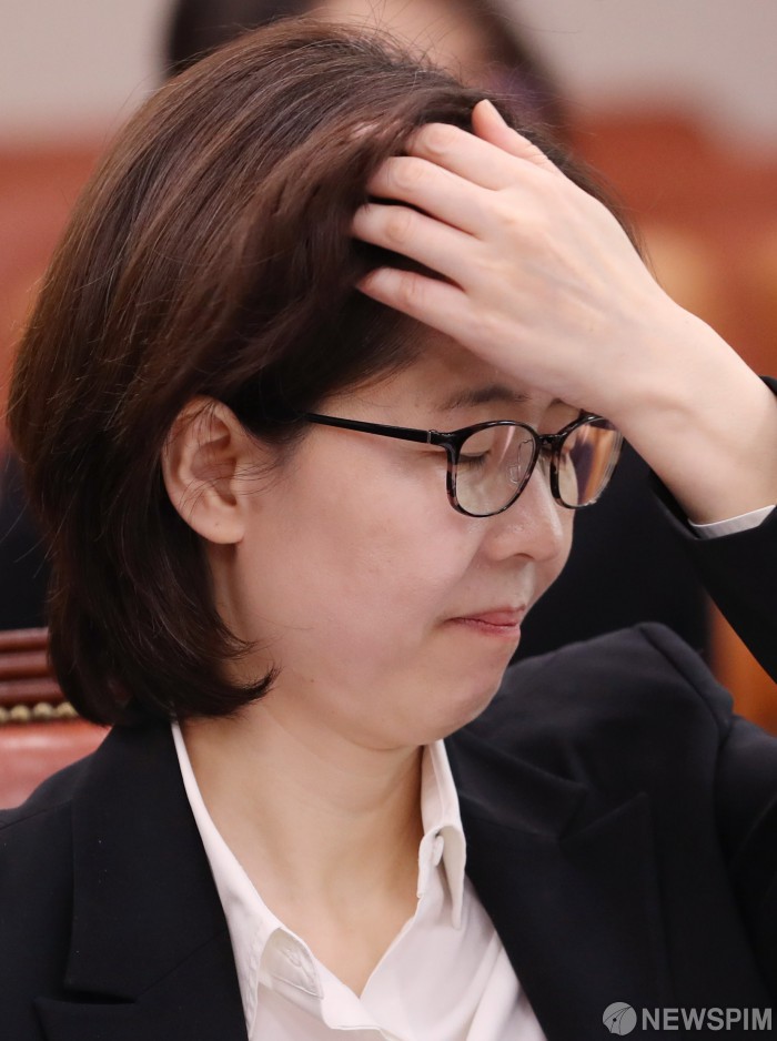 [서울=뉴스핌] 김학선 기자 = 이미선 헌법재판관 후보자가 10일 국회에서 열린 인사청문회에서 계속되는 주식 의혹과 관련된 질의에 난감한 듯 머리를 쓸어넘기고 있다. 2019.04.10 yooksa@newspim.com