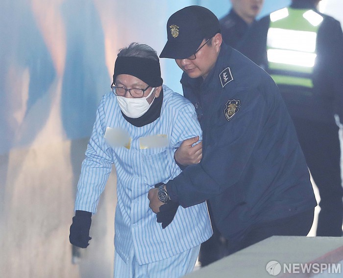 [서울=뉴스핌] 윤창빈 기자 = 박근혜 정부 시절 보수단체에 지원을 강요한 혐의(화이트리스트)를 받는 김기춘 전 청와대 비서실장이 12일 오후 서울 서초구 서울고등법원에서 열린 항소심 공판에 출석하고 있다. 2019.04.12 pangbin@newspim.com