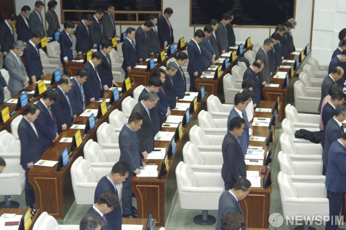 [서울=뉴스핌] 백인혁 인턴기자 = 15일 오후 서울 종로구 서울시의회에서 열린 '제286회 임시회 개회식'에참석한 시의원들이 세월호 참사 5주기를 맞아 희생자들에 대한 묵념을 하고 있다. 2019.04.15 dlsgur9757@newspim.com