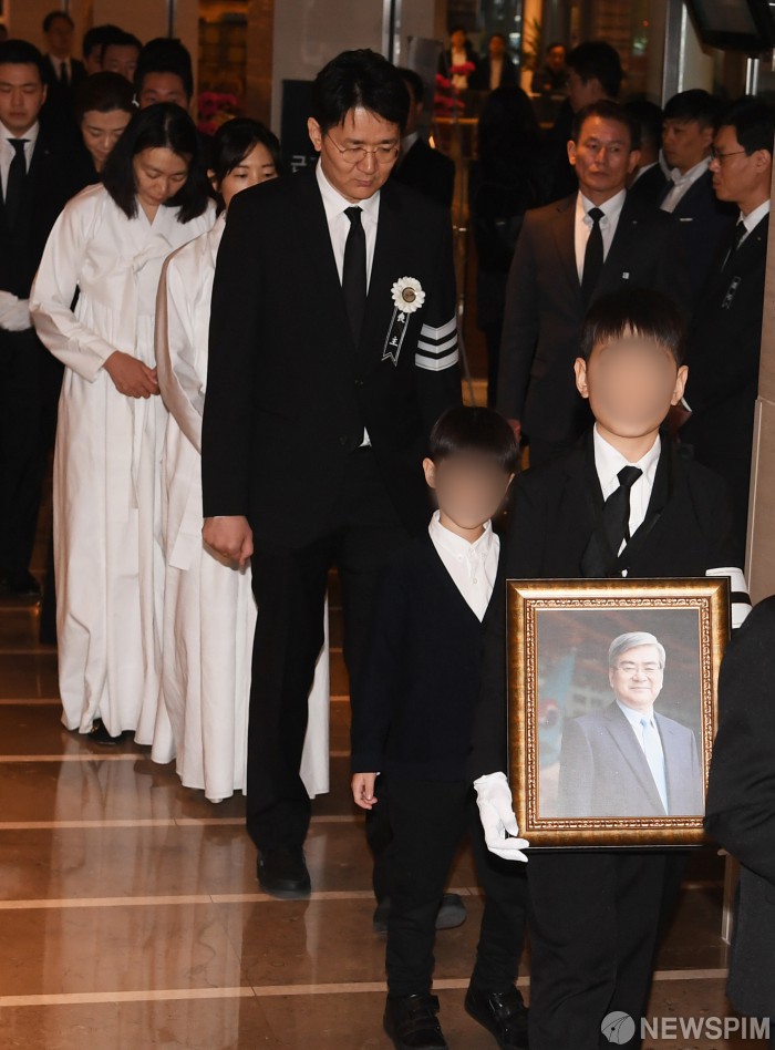 [서울=뉴스핌] 윤창빈 기자 = 고(故) 조양호 한진그룹 회장 발인이 16일 오전 서울 서대문구 신촌세브란스 병원 장례식장에서 진행된 가운데 조 회장의 영정 뒤로 조원태 대한항공 사장과 조현아 전 대한항공 부사장, 조현민 전 대한항공 전무가 영결식장으로 이동하고 있다. 2019.04.16 pangbin@newspim.com