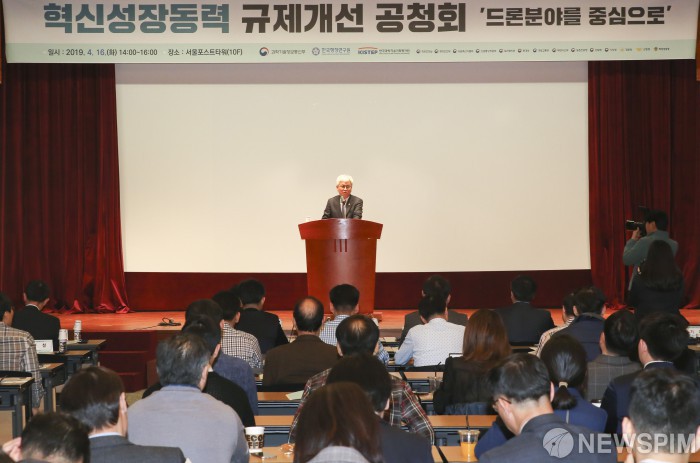 [서울=뉴스핌] 이한결 인턴기자 = 임대식 과학기술정보통신부 본부장이 16일 오후 서울 중구 포스트타워에서 개최된 ‘혁신성장동력 규제개선 공청회: 드론분야를 중심으로’ 에서 인사말을 하고 있다. 2019.04.16 alwaysame@newspim.com