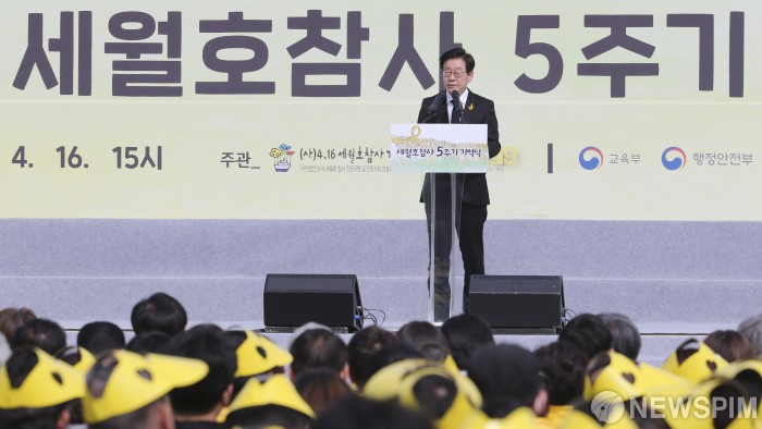[안산=뉴스핌] 이형석 기자 = 이재명 경기도 지사가 16일 오후 경기도 안산시 단원고 화량유원지에서 열린 세월호참사 5주기 기억식에서 추도사를 하고 있다. 2019.04.16 leehs@newspim.com